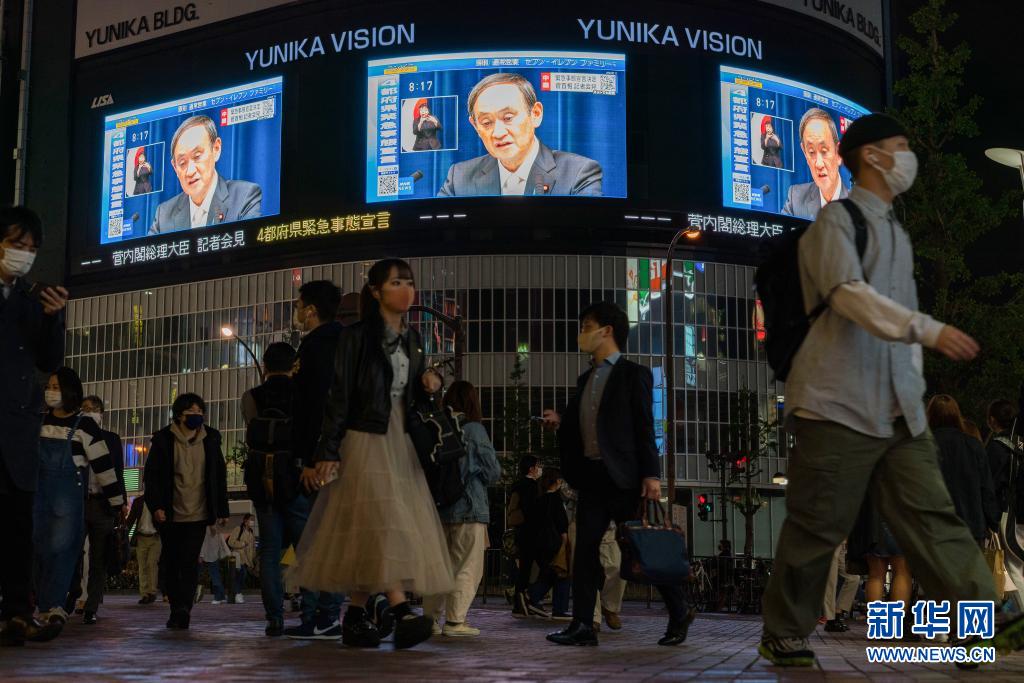 4月23日,日本东京街头大屏幕上播放首相菅义伟宣布进入紧急状态的新闻发布会画面。新华社发(克里斯托弗·朱摄)