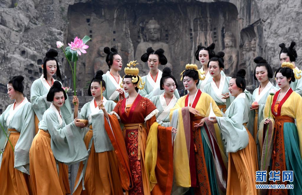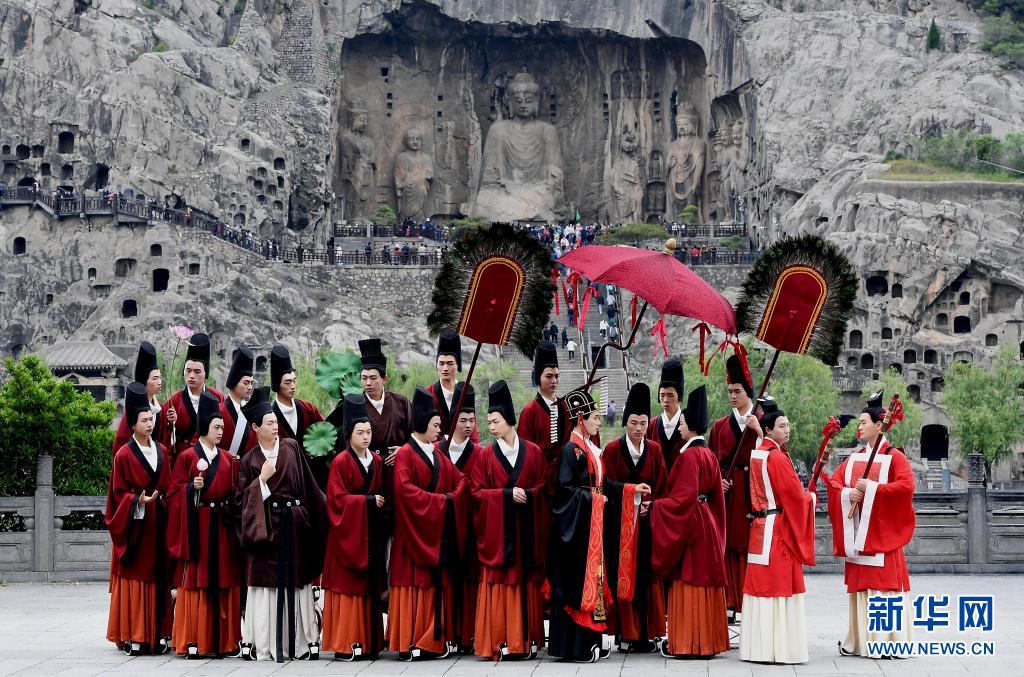 演员在洛阳龙门石窟景区礼佛台演绎龙门石窟《帝后礼佛图》(4月25日摄)。新华社记者 李安 摄