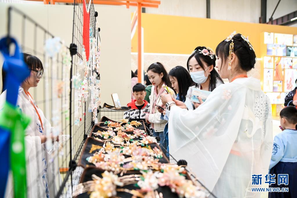 汉服爱好者在“第一届汉服博览会”会场挑选商品(5月3日摄)。新华社发(修武县委宣传部供图)