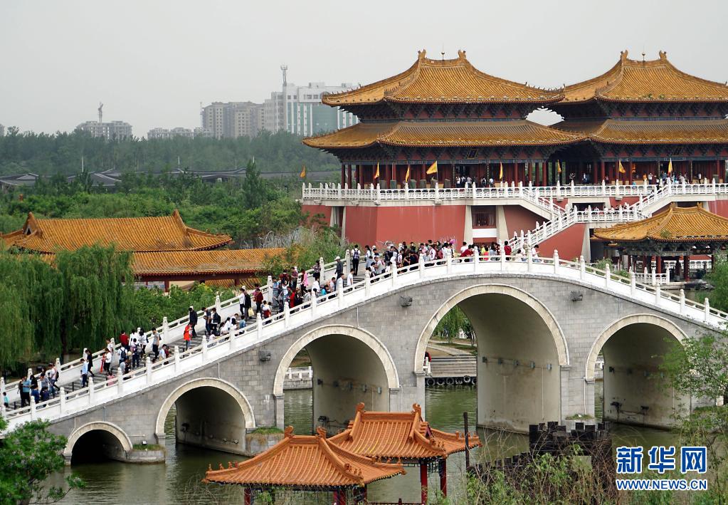 游客在开封清明上河园景区内游览(2016年5月2日摄)。新华社记者 李安 摄