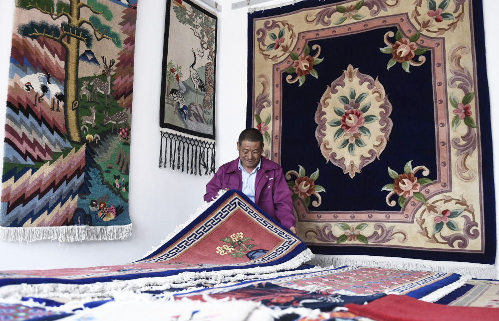 ↑6月5日,在西宁市湟中县加牙村,国家级非物质文化遗产项目加牙藏族织毯技艺传承人杨永良在整理制作好的藏毯。