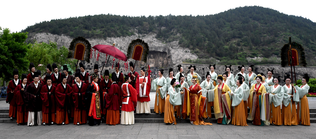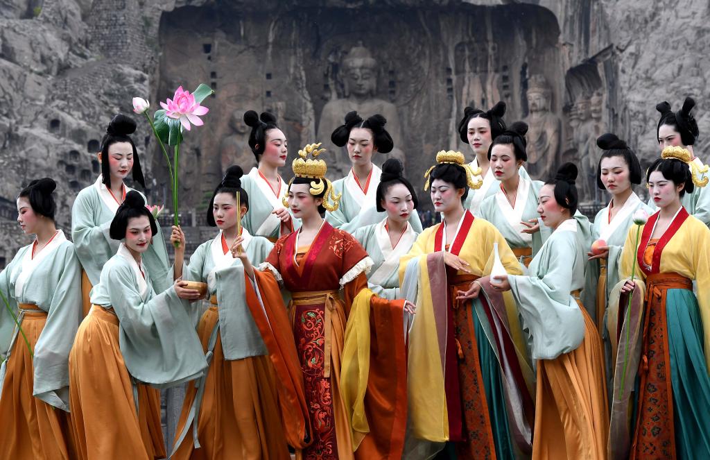 演员在洛阳龙门石窟景区礼佛台演绎龙门石窟《帝后礼佛图》(4月25日摄)。新华社记者 李安 摄