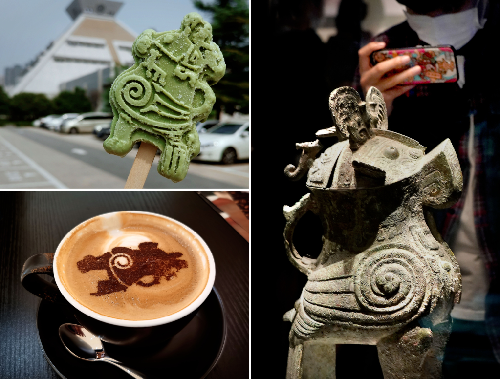 拼版照片:右图为2020年9月24日,参观者在河南博物院主展馆内拍摄展品“妇好鸮尊”(新华社记者李安摄);左上图为2020年9月24日拍摄的河南博物院推出的“妇好鸮尊”冰淇淋(新华社记者李安摄);左下图为2020年9月24日拍摄的河南博物院推出的“妇好鸮尊”图样咖啡(新华社记者李文哲摄)。