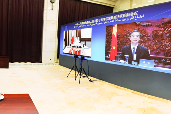 6月23日下午,中华人民共和国首席大法官、最高人民法院院长周强在北京通过视频,与卡塔尔国最高司法委员会主席、最高法院院长哈桑·本·拉赫丹·哈桑·穆罕纳迪举行工作会谈。