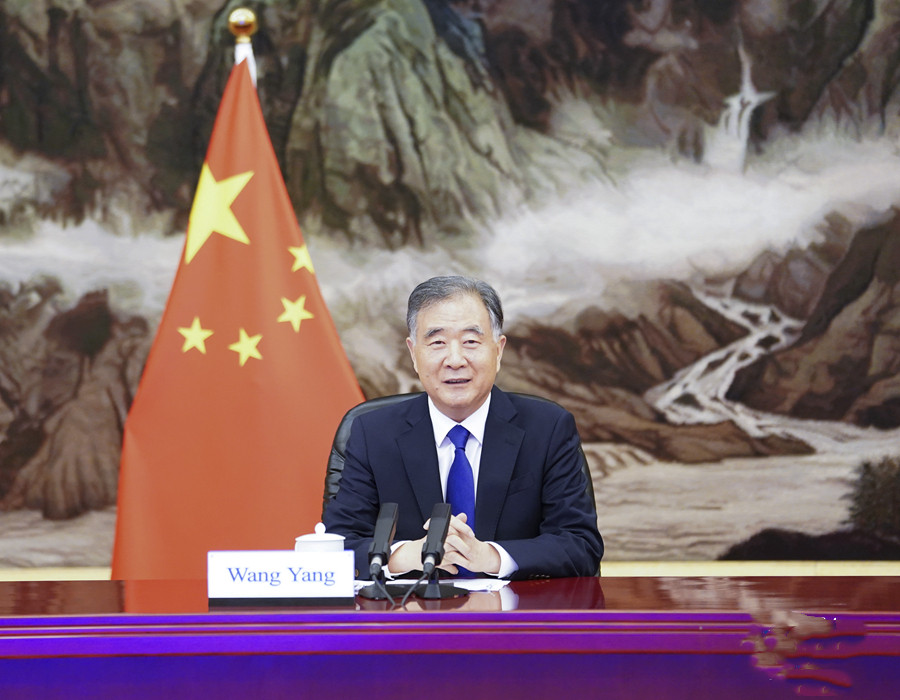 6月29日,中共中央政治局常委、全国政协主席汪洋在北京以视频方式会见老挝人民革命党中央政治局委员、建国阵线中央主席辛拉冯。新华社记者 燕雁 摄