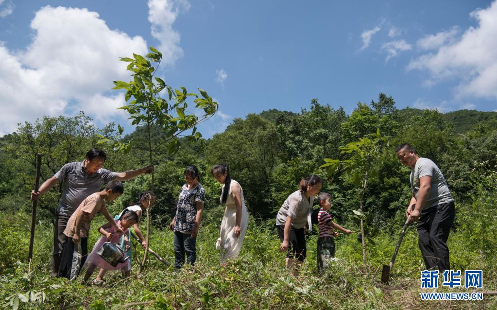 姚祖元(右一)与家人一起种树(2019年7月13日摄)。在秦岭深处的陕西省汉中市留坝县火烧店镇,姚家五代人历时70年深耕秦岭的故事在当地家喻户晓,传为佳话。新华社记者 陶明 摄