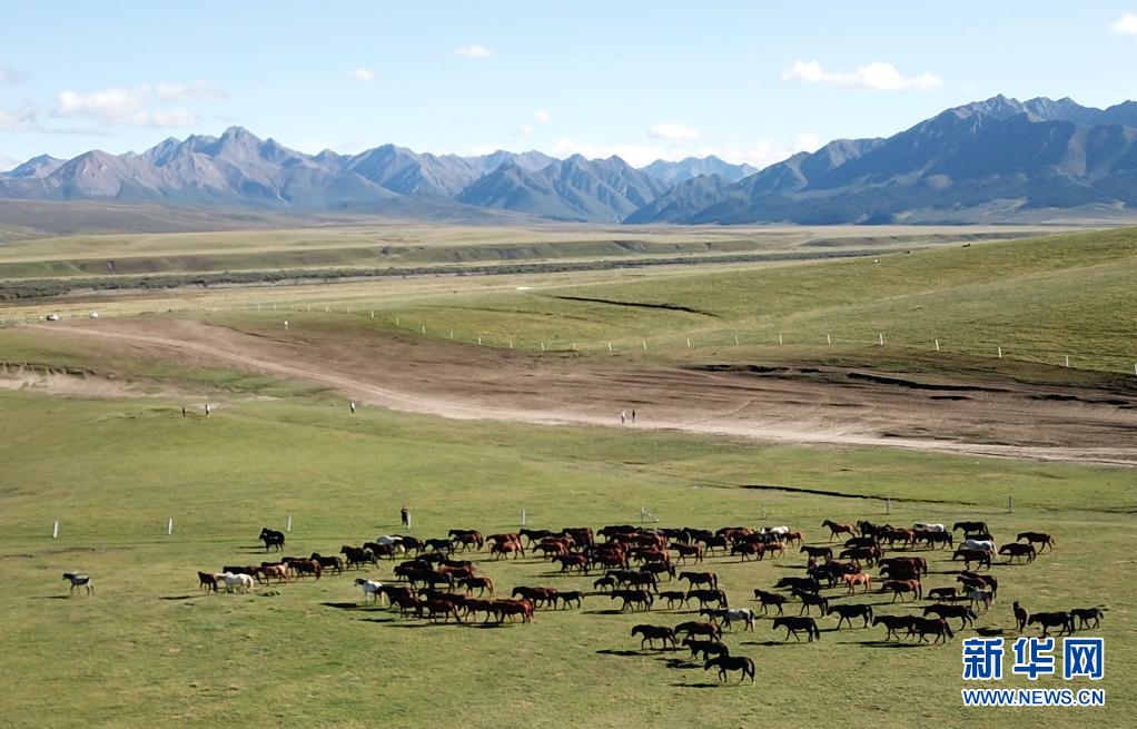 在祁连山脚下的山丹马场拍摄的马群(2019年9月10日摄,无人机照片)。新华社记者 马宁 摄