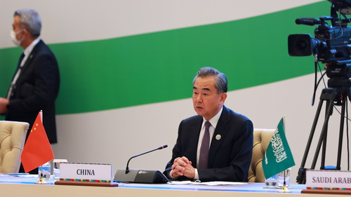 当地时间2021年7月16日,国务委员兼外长王毅在塔什干出席“中亚和南亚:地区互联互通的挑战和机遇”高级别国际会议。