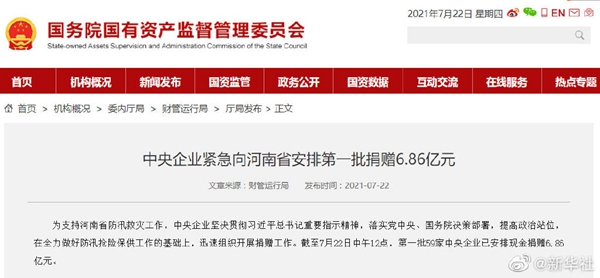记者从国务院国资委了解到,为支持河南省防汛救灾工作,中央企业坚决落实党中央、国务院决策部署,在全力做好防汛抢险保供工作基础上,迅速组织开展捐赠工作。截至7月22日中午12点,第一批59家中央企业已安排现金捐赠6.86亿元。(记者王希)