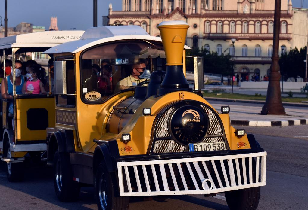 2020年7月4日,人们在古巴首都哈瓦那乘坐重新运行的观光车。(新华社记者朱婉君摄)