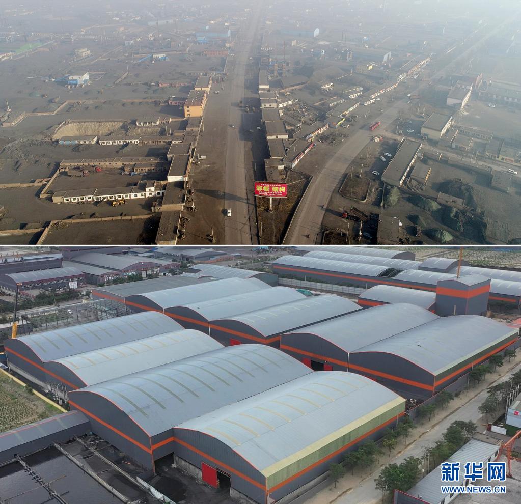 拼版照片:上图为宁夏石嘴山市平罗县崇岗煤炭集中区厂房整治前的景象(资料照片);下图为宁夏石嘴山市平罗县崇岗煤炭集中区厂房整治后的景象(新华社记者卢鹰7月28日摄,无人机照片)。新华社发