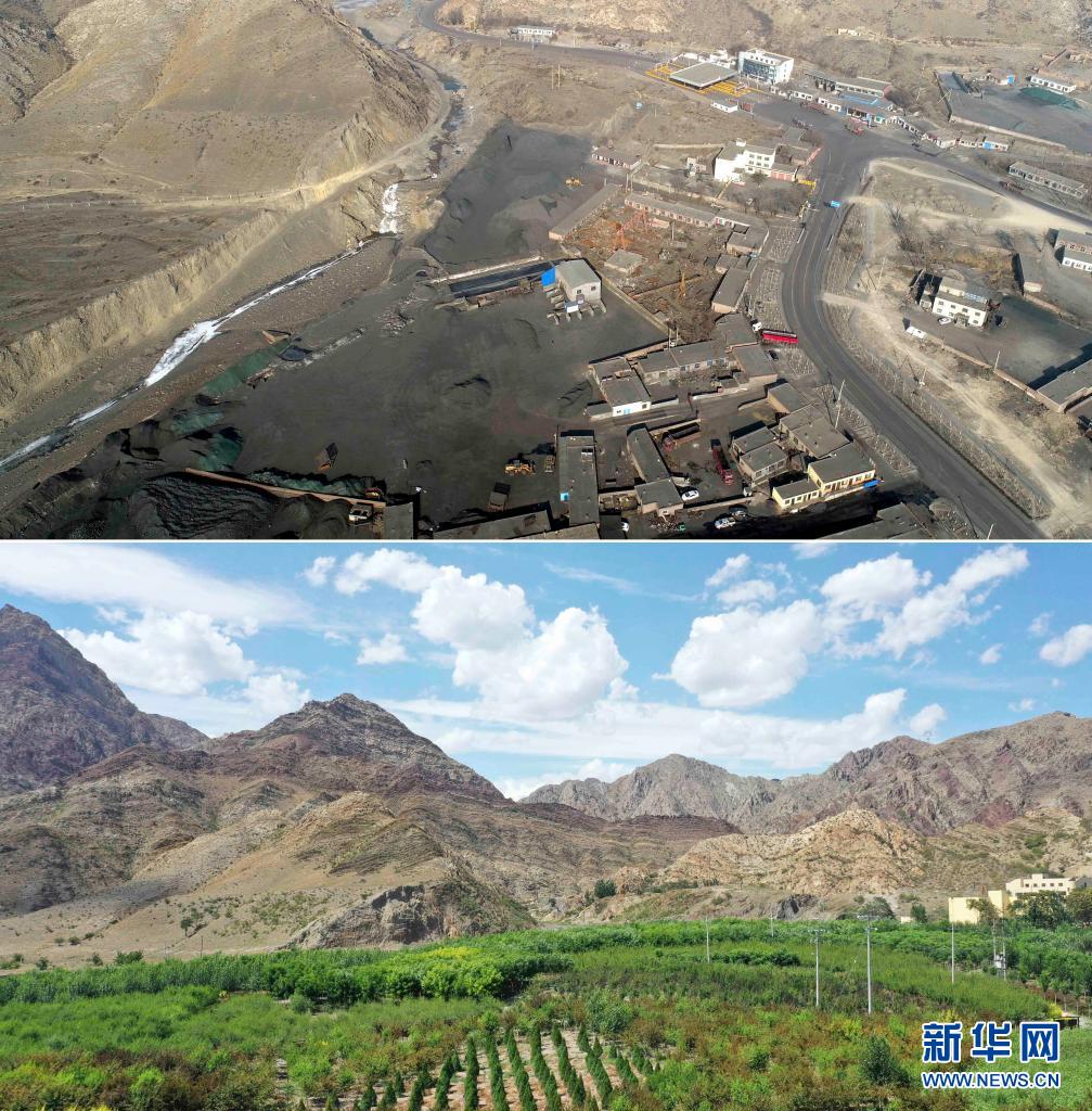 拼版照片:上图为宁夏石嘴山市平罗县崇岗煤炭集中区整治前的景象(资料照片);下图为宁夏石嘴山市平罗县崇岗煤炭集中区整治后的景象(新华社记者卢鹰7月26日摄)。新华社发
