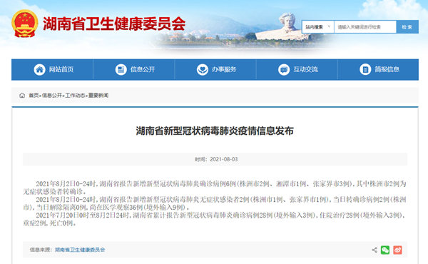 2021年8月2日0-24时,湖南省报告新增新型冠状病毒肺炎确诊病例6例(株洲市2例、湘潭市1例、张家界市3例),其中株洲市2例为无症状感染者转确诊。