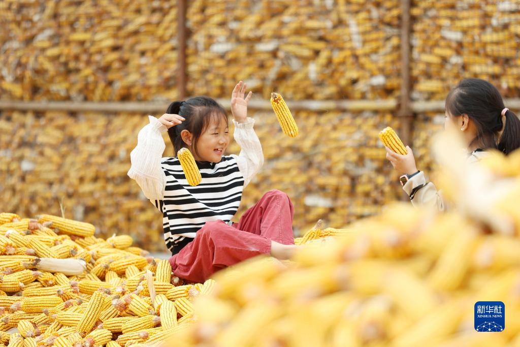 10月3日,在山东省临沂市郯城县郯城街道宋屯村,两名小女孩在玉米堆上玩耍。