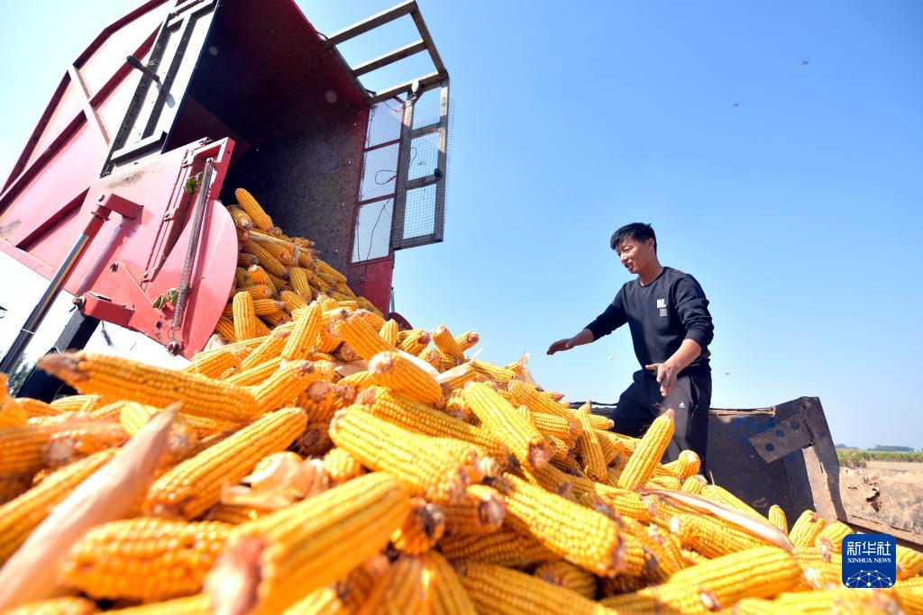 10月3日,在山东省聊城市茌平区贾寨镇侯楼村,村民在田间收获玉米。