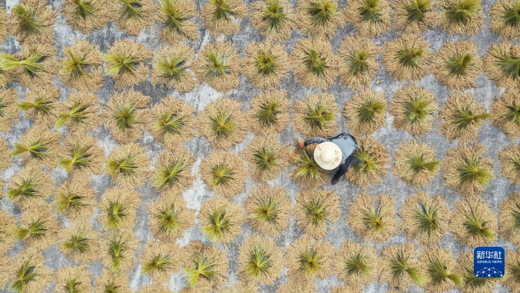 10月12日,村民在贵州省黔东南苗族侗族自治州从江县刚边壮族乡刚边村晾晒糯稻(无人机照片)。
