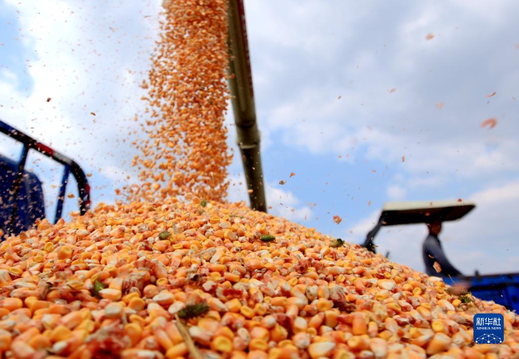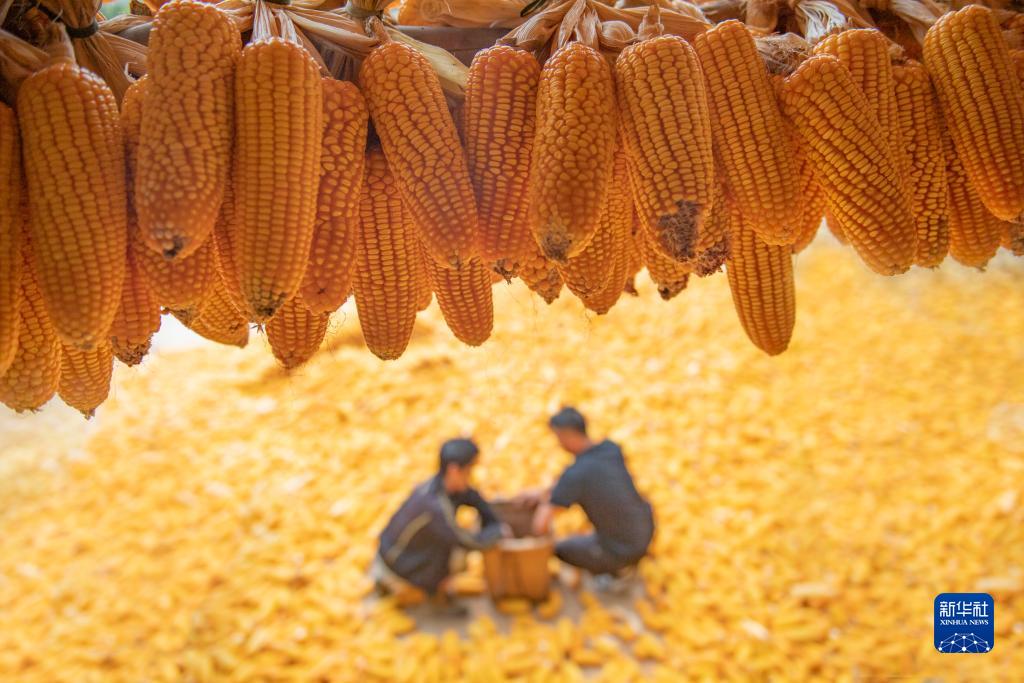 10月12日,云南省文山壮族苗族自治州文山市追栗街镇的农民晾晒收获的玉米。