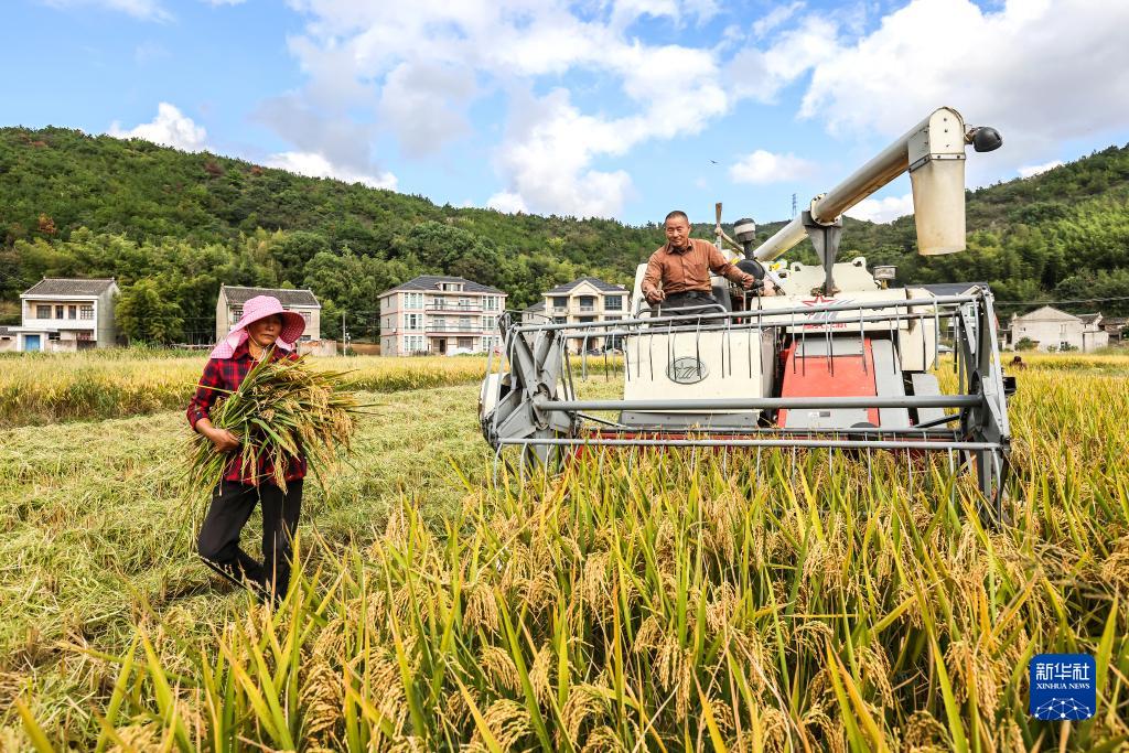 10月12日,在浙江省兰溪市上华街道陈家村,种粮大户忙着抢收单季稻。