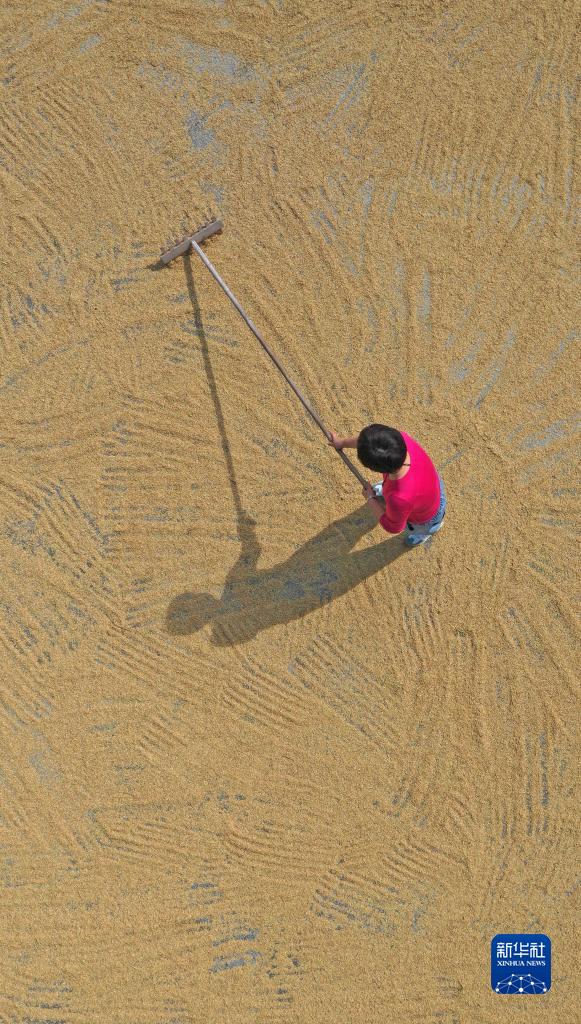 金秋时节,农民忙着收获晾晒,丰收图景美如画。