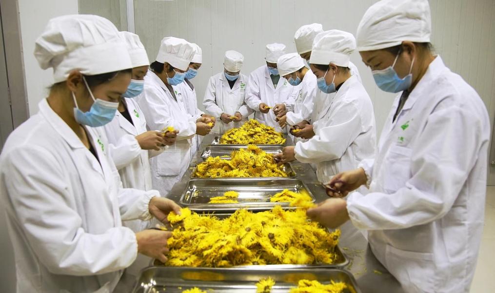 开封大观商业管理有限公司的工人们挑选优质菊茶进行分拣。(受访单位供图)