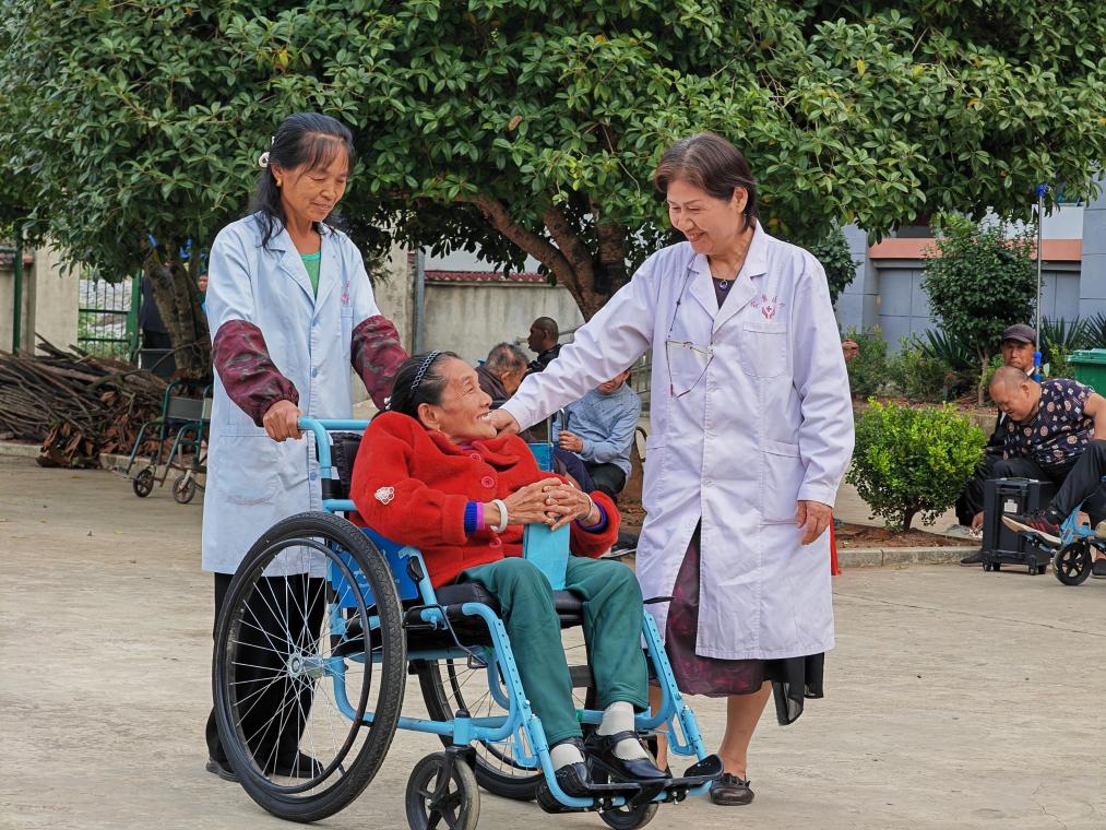 在湖北省黄石市阳新县排市镇福利院,失能老人袁细英在院子里与护理人员聊天。新华社记者王自宸 摄