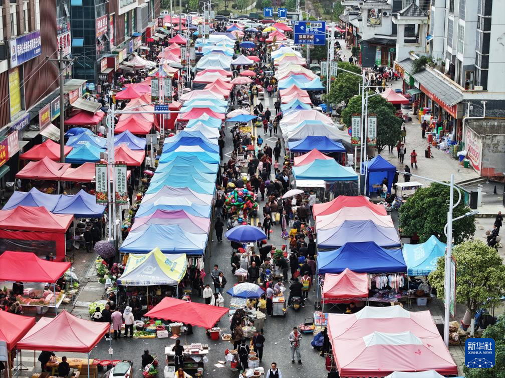 1月14日,人们在贵州省黔南布依族苗族自治州福泉市金山街道办事处赶集(无人机照片)。