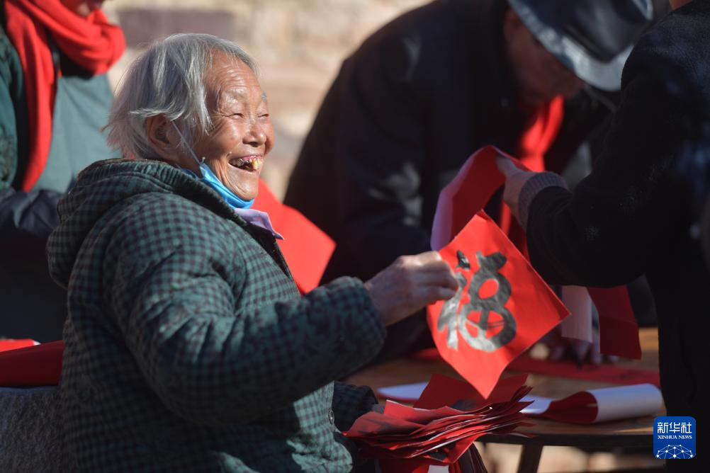 1月14日,在河北省石家庄市井陉县东尖山村,村中老人拿着书法爱好者送来的新春福字。