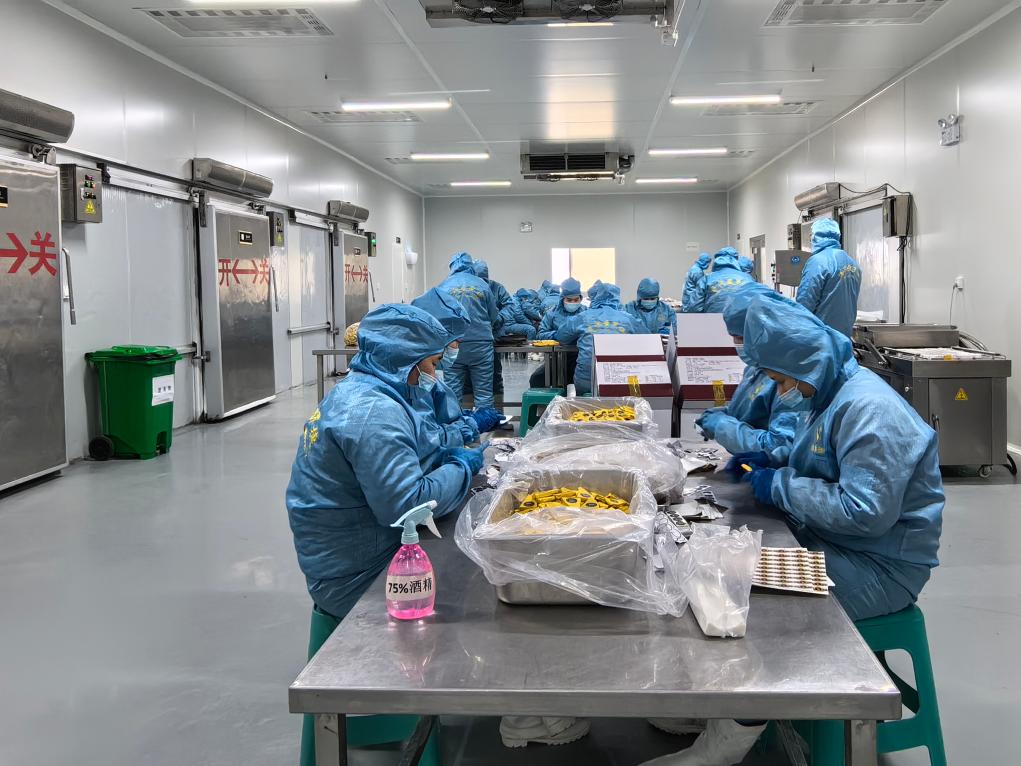 山东尊润圣罗捷食品有限公司的车间内,工人正在包装鹅肝制品。(新华社记者叶婧 摄)