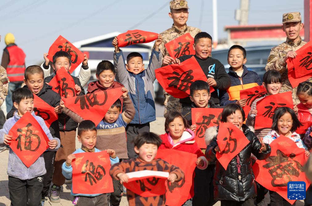 在甘肃省积石山县阳洼村,武警甘肃总队临夏支队官兵和小朋友一起展示“福”字(1月30日摄)。新华社发(侯崇慧 摄)