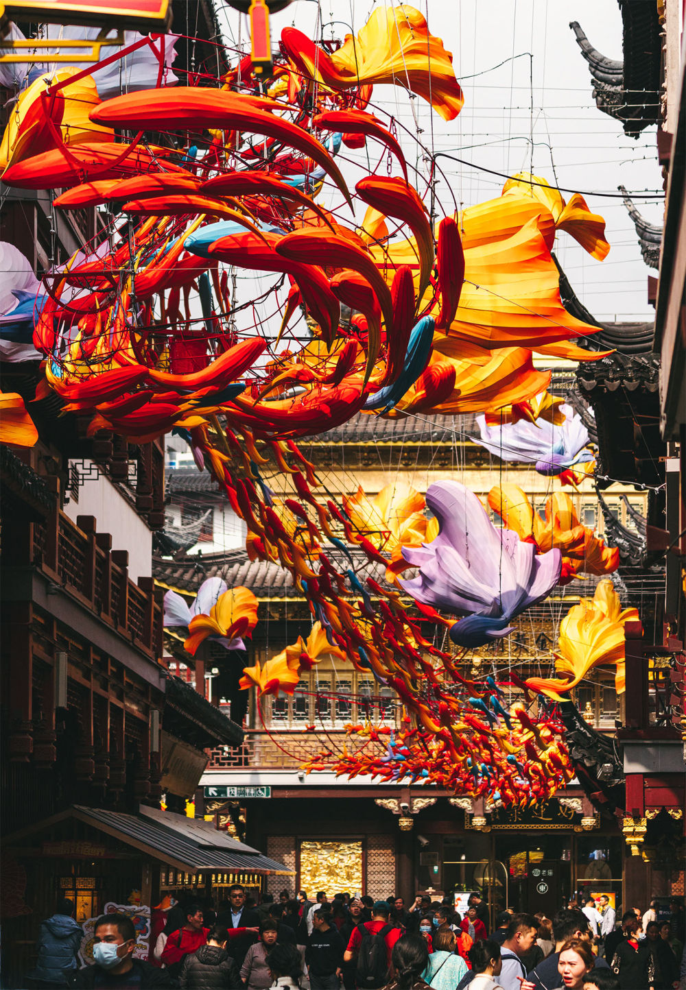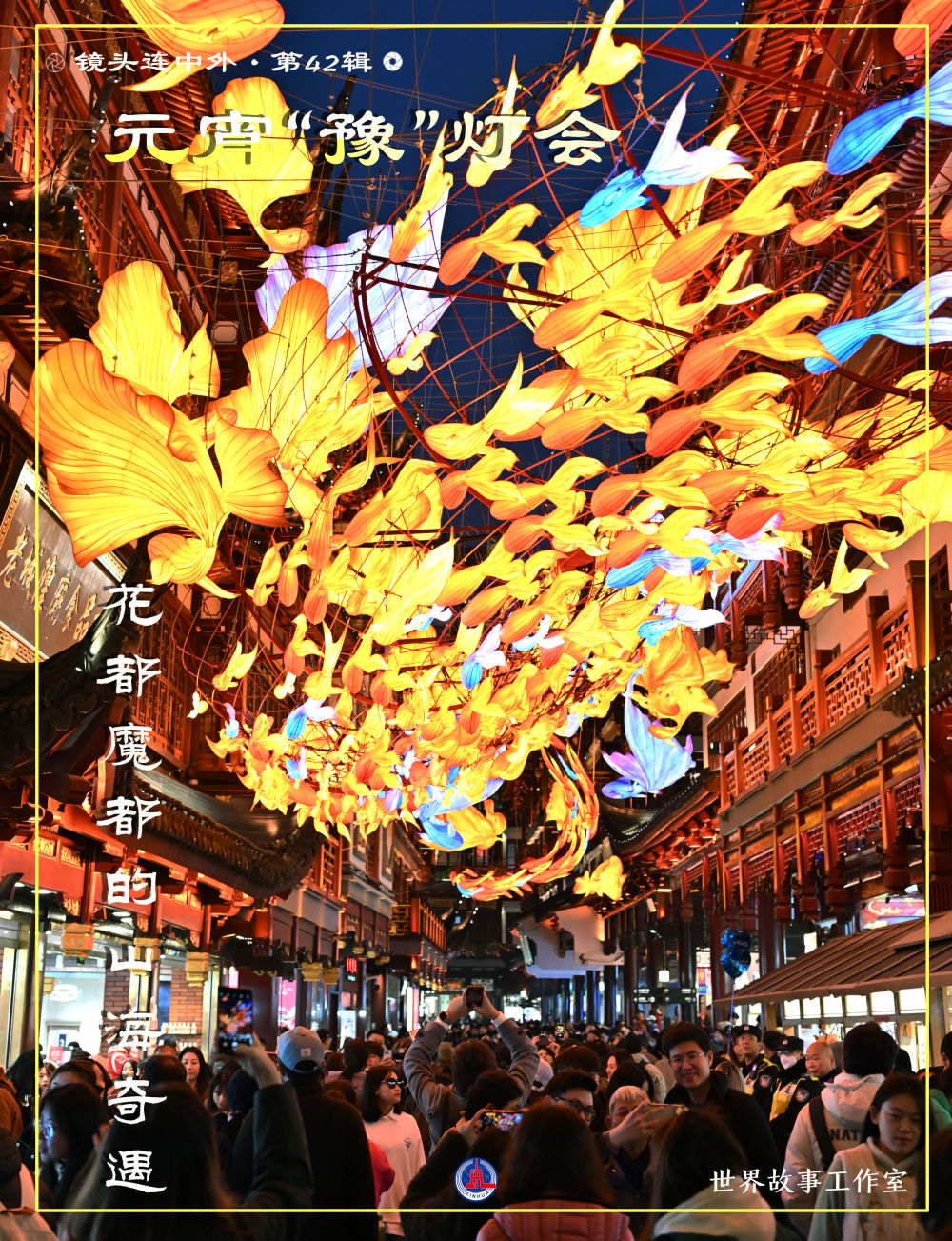 ↑这是在上海豫园商城拍摄的“一夜鱼龙舞”主题灯组与观灯人潮。