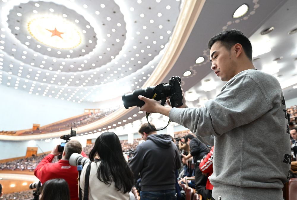 新华社记者刘卫兵在人民大会堂采访。
