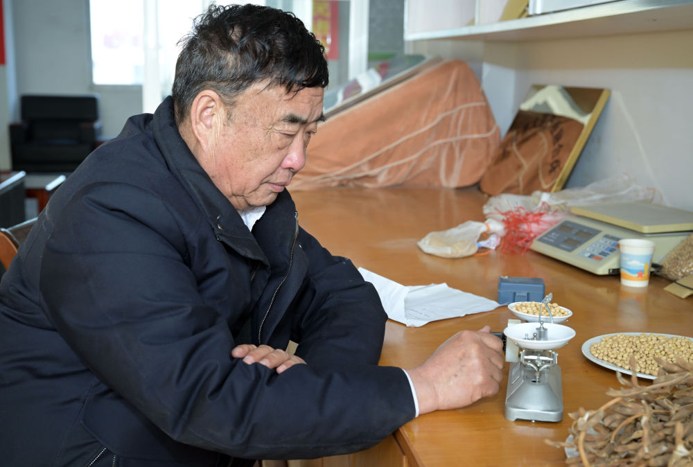 2023年2月21日,在太和县淙祥现代农业种植专业合作社,徐淙祥在实验室里对农作物样品进行称重和记录。