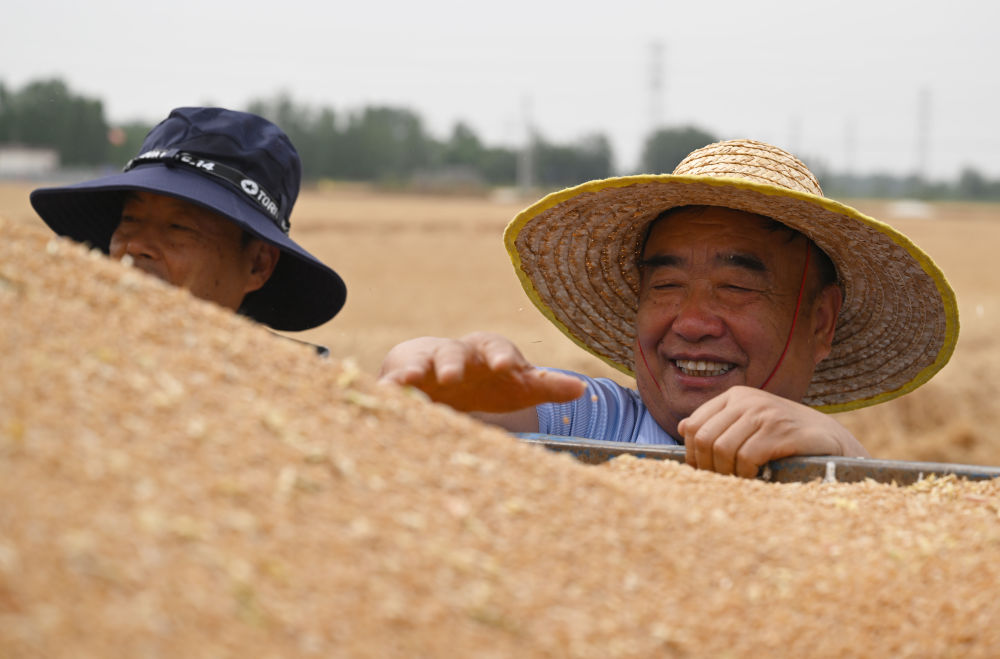 麦收时节,在安徽阜阳太和县,机器轰鸣,麦浪翻滚如金色绸缎,饱满的麦粒装满一辆辆运粮车的货厢。
