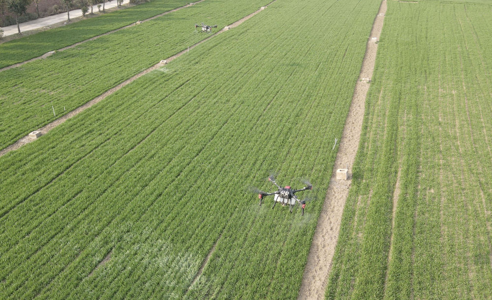 2023年2月21日,在太和县淙祥现代农业种植专业合作社,无人机喷洒农药(无人机照片)。