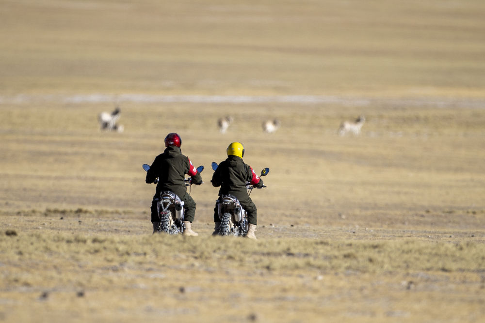2023年12月17日,在西藏羌塘国家级自然保护区,野生动物管护队员骑着摩托车观察藏羚羊。