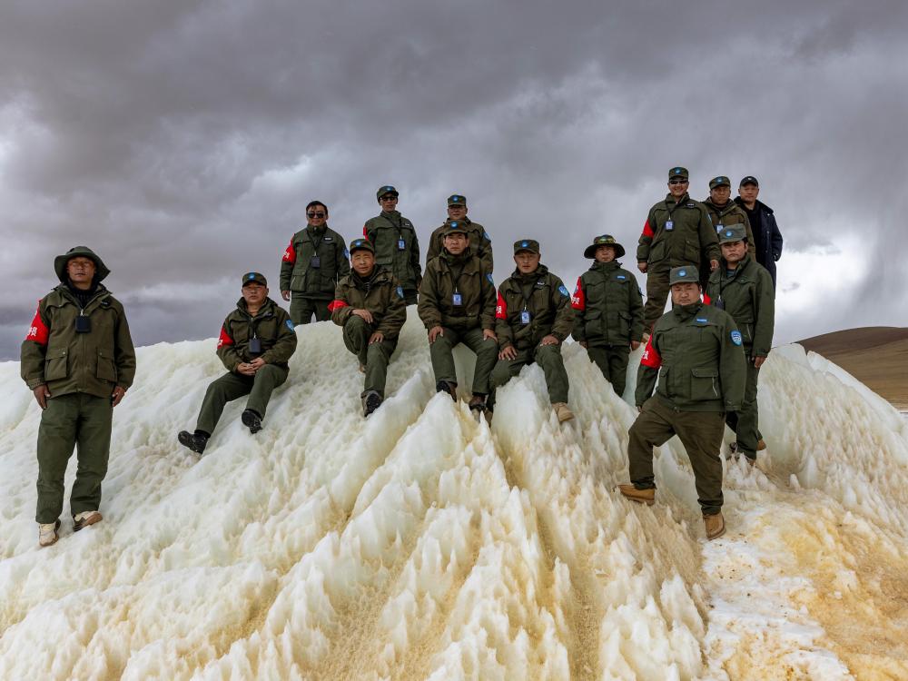 2024年5月7日,在西藏羌塘国家级自然保护区,野生动物专业管护队员在巡护路上一处垭口的冰雪堆上合影。