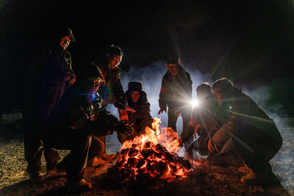 2024年5月10日,野生动物专业管护队员在西藏羌塘国家级自然保护区的宿营地用野牦牛粪烤火取暖。