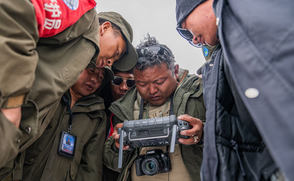 2024年5月10日,在西藏羌塘国家级自然保护区,罗布玉杰管护站站长格桑伦珠(右二)和队员们在大雪中操作无人机观察藏羚羊迁徙情况。