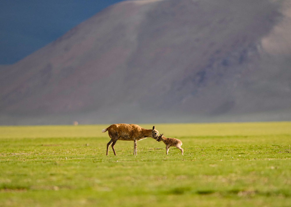 这是2024年6月16日在西藏那曲市申扎县买巴乡鲁确塘草原上拍摄的藏羚羊母子。