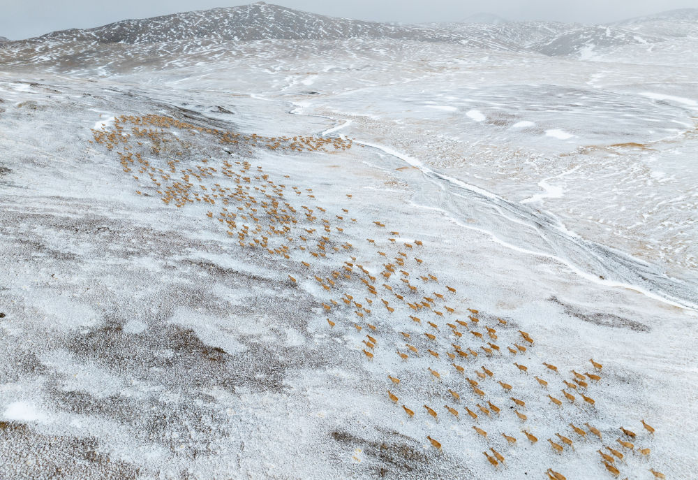 2024年6月15日清晨雪后,在西藏羌塘国家级自然保护区,一群藏羚羊迎着朝霞前行在迁徙路上。