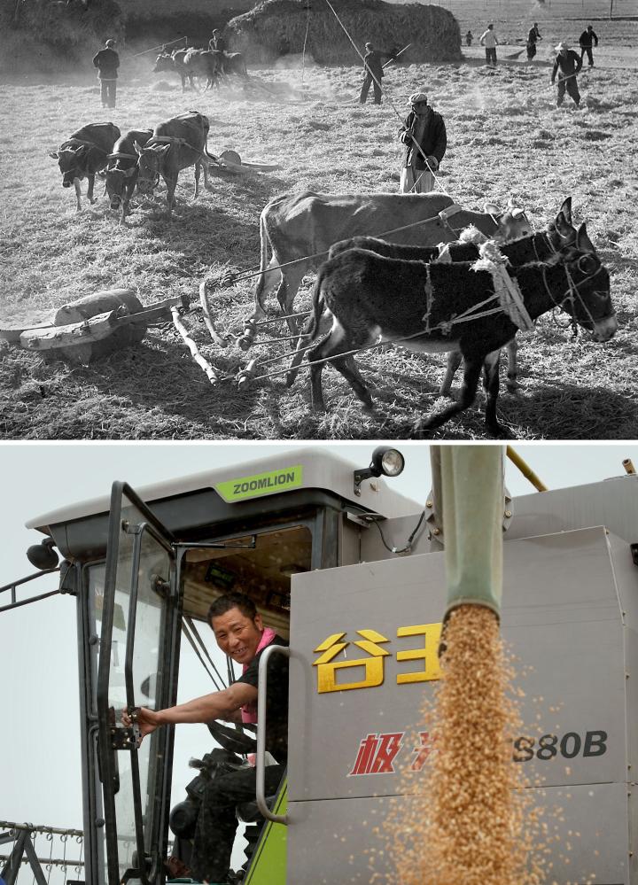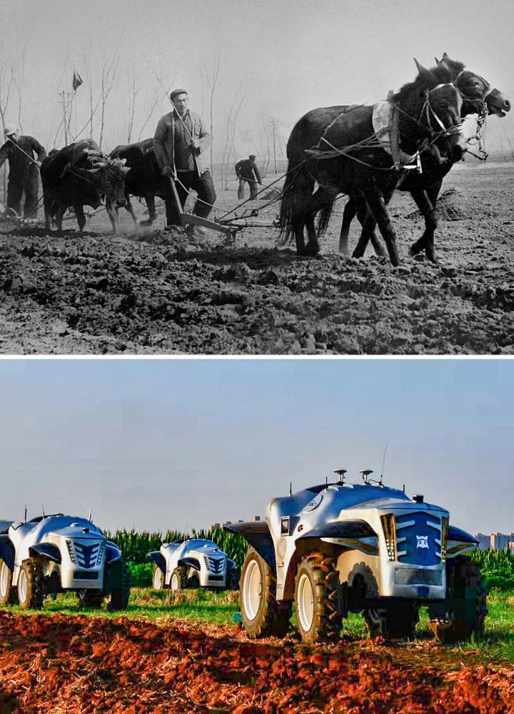 拼版照片:上图为1954年,河南开封农民在用传统的畜拉步犁耕地(吕学召 摄);下图为2019年7月26日,洛阳一拖集团生产的纯电动无人驾驶拖拉机准备做耕地测试(潘郁 摄)。