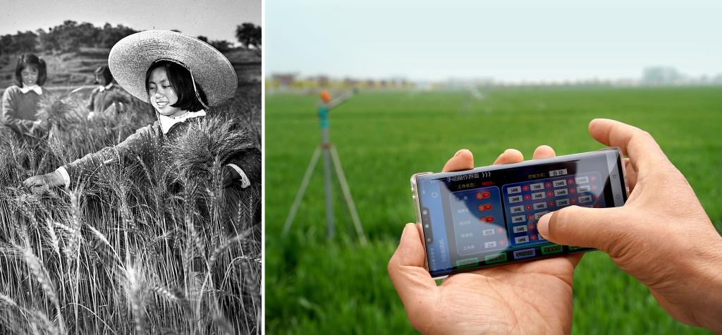拼版照片:左图为1961年,河南新县陡山河乡的技术员在进行田间调查,确定小麦选种地块(新华社记者 张青云 摄);右图为2021年4月14日,在河南商水一处高标准农田里,种粮大户邱守先使用手机操控设备对小麦田进行自动喷灌(新华社记者 李安 摄)。