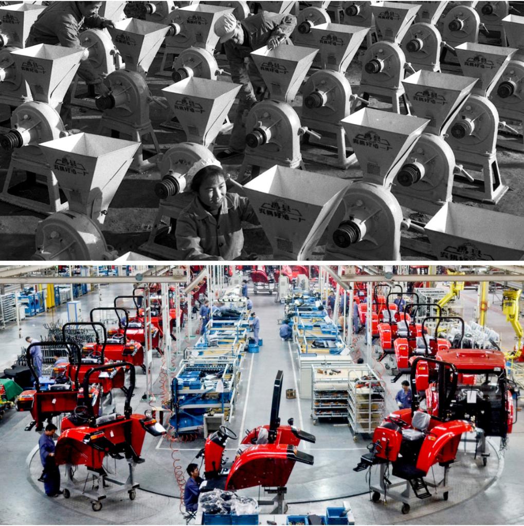 拼版照片:上图为1971年,河南禹县(现禹州市)生产的大批粉碎机准备运送出厂(蔡玉琦 摄);下图为2012年9月12日拍摄的河南洛阳一拖集团东方红拖拉机生产线(新华社发)。