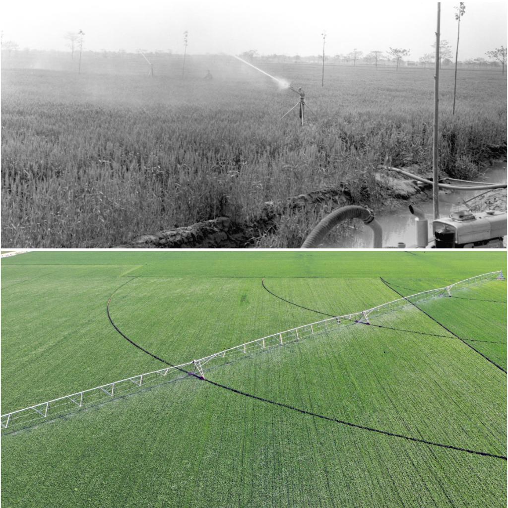 拼版照片:上图为1981年,河南兰考爪营公社爪营三大队购买了12部喷灌机,在抗灾中发挥了巨大作用,小麦获得丰收(新华社记者 朱广智 摄);下图为2020年4月24日,在河南省浚县30万亩高标准粮田示范区内,大型喷灌机在进行喷灌作业摄(新华社记者 李嘉南 摄)。