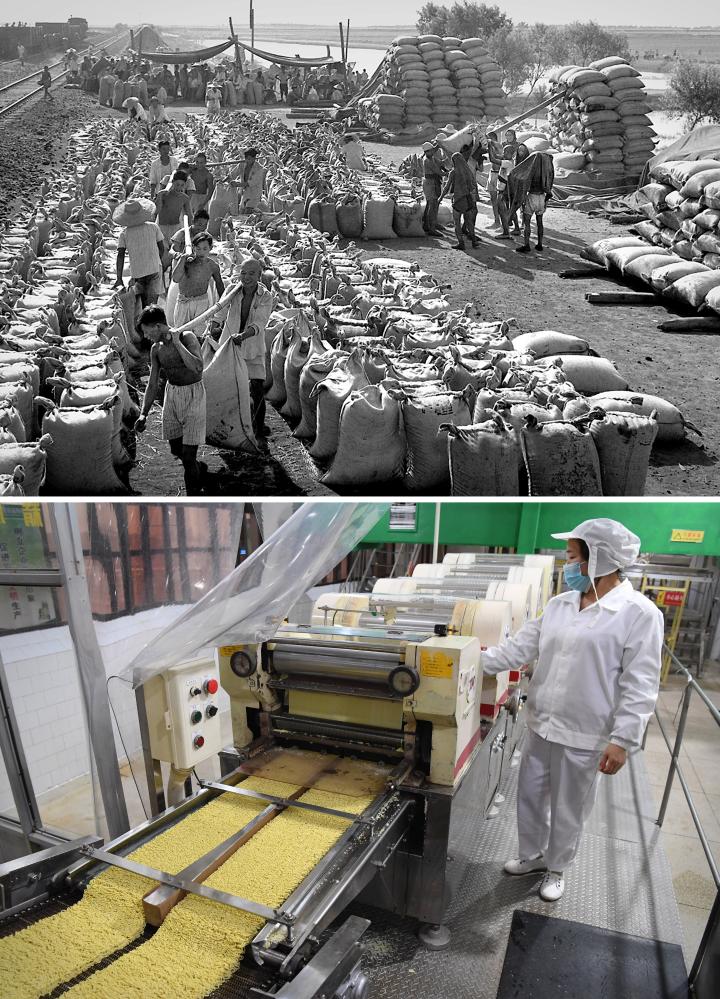 拼版照片:上图为1963年,河南郾城裴城车站粮食收购站,堆放着大批农民交售的原粮(新华社记者 杨丙文 摄);下图为2018年11月27日,在河南临颍一家方便面生产企业,工作人员在车间流水线上作业(新华社记者 李安 摄)。