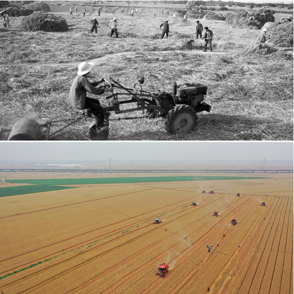 拼版照片:上图为20世纪50年代,河南偃师万亩丰产区开镰收割小麦(新华社记者 唐茂林 摄);下图为2021年6月6日,在河南周口黄泛区农场九分场的麦田里,农机手操作收割机收获小麦(新华社记者 李安 摄)。