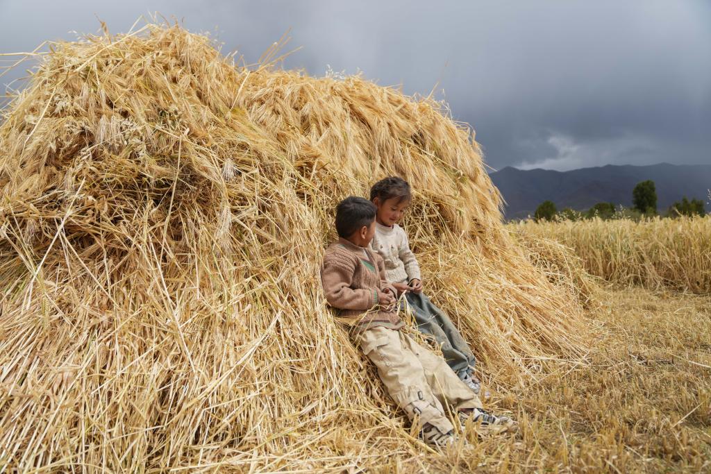 2024年9月10日,在西藏日喀则市白朗县巴扎乡,孩子们靠在青稞垛上玩耍。新华社记者 晋美多吉 摄