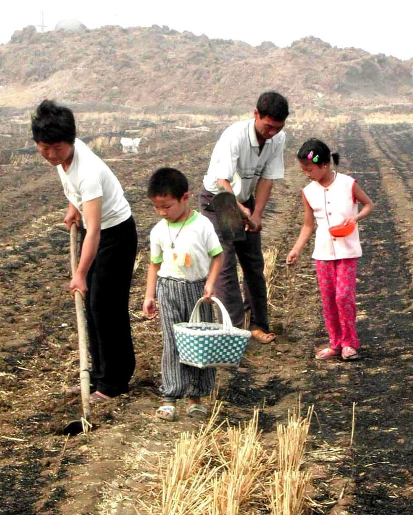 2001年,在河南汝阳,一户农民用村里的移动喷灌设施浇完地后,全家4口抢墒点种秋玉米。新华社记者 王颂 摄