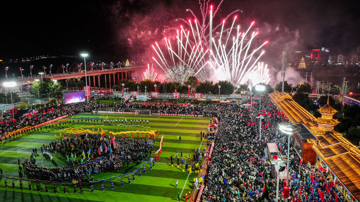 2024年2月3日,在贵州省榕江县,2024全国“村晚”示范展示活动暨贵州“村超村晚”举行音乐烟花秀表演(无人机照片)。新华社记者 刘续 摄