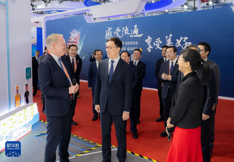 11月26日,国家副主席韩正在北京出席第二届中国国际供应链促进博览会开幕式并致辞。开幕式后,韩正巡视链博会展馆,并与有关企业负责人互动交流。新华社记者 翟健岚 摄